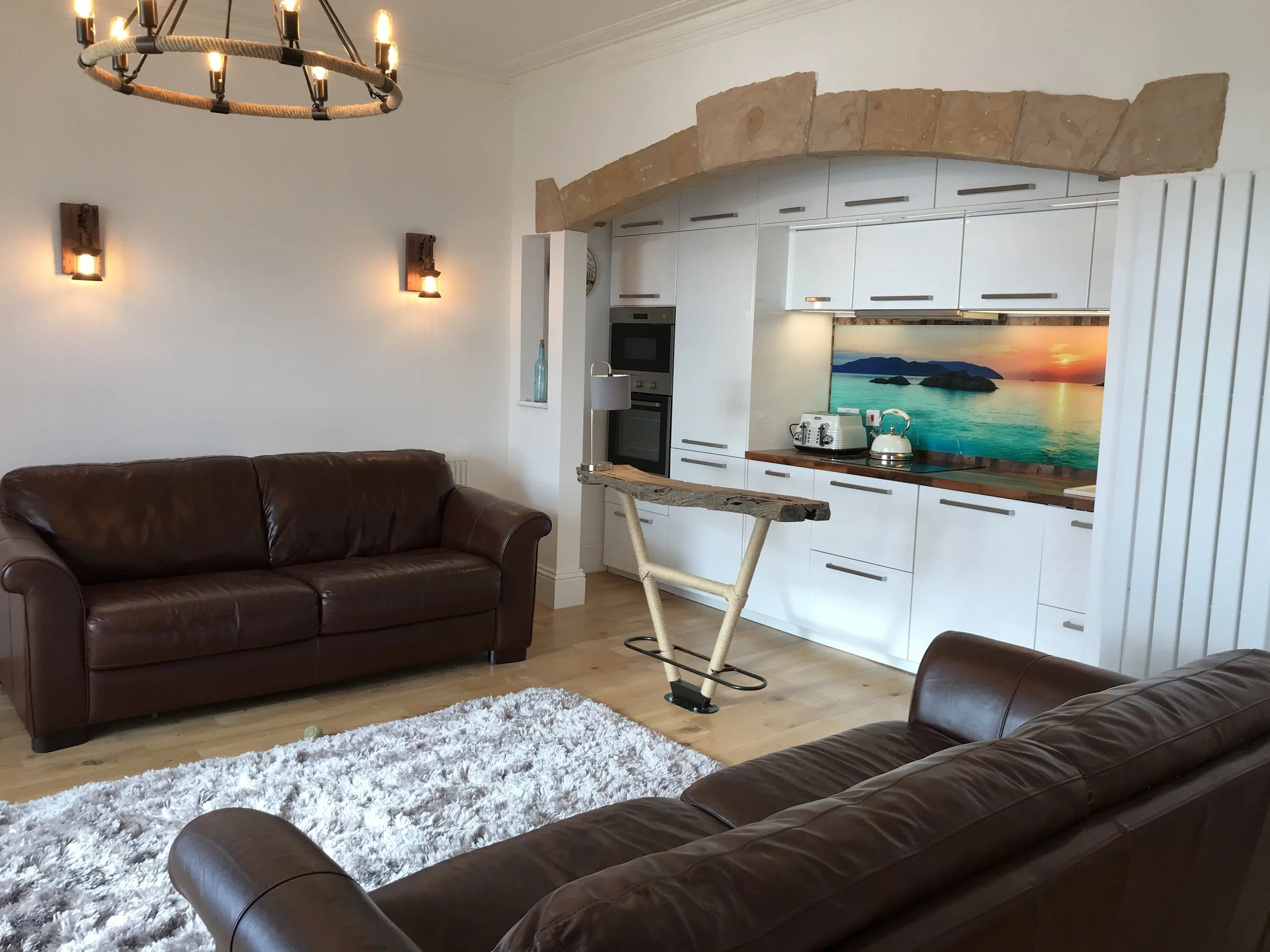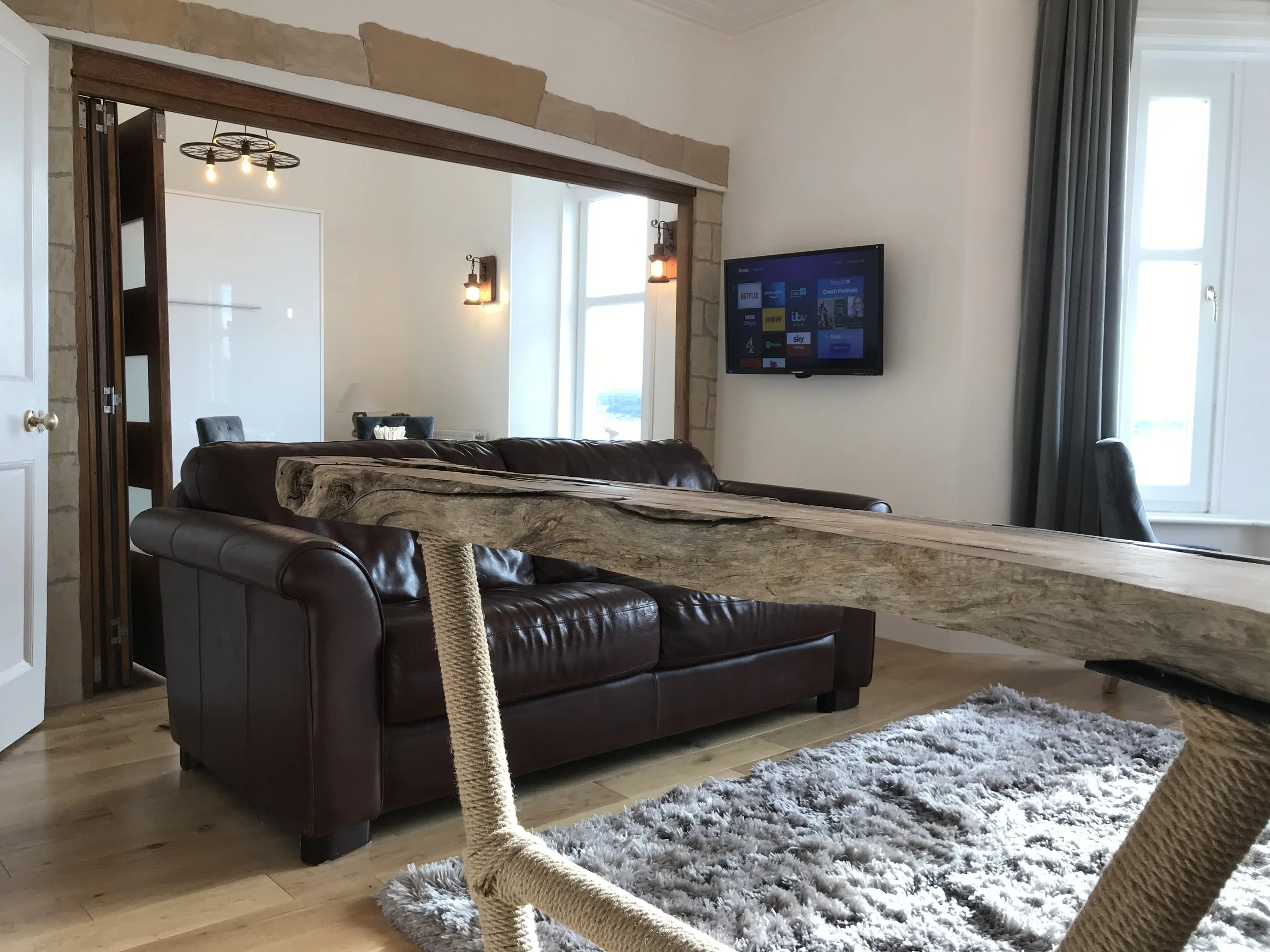 Our flat has been professionally renovated, being Architecturally re-designed to provide flexible living accommodation. It can be used as spacious two bedroom two bathroom accommodation, but can also be opened up to a more open plan layout for smaller parties to enjoy. The flat has been transformed into a bright interesting space, with quality hardwood and porcelain tiling finishes to floors and modern decor throughout including Nest controlled central heating.