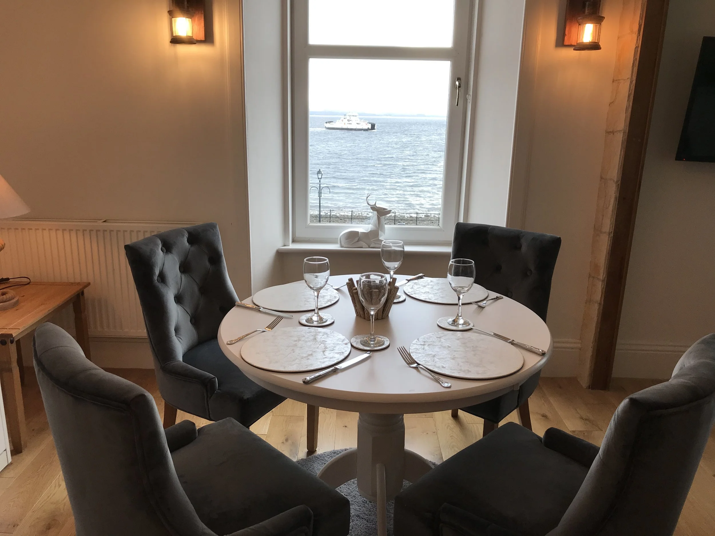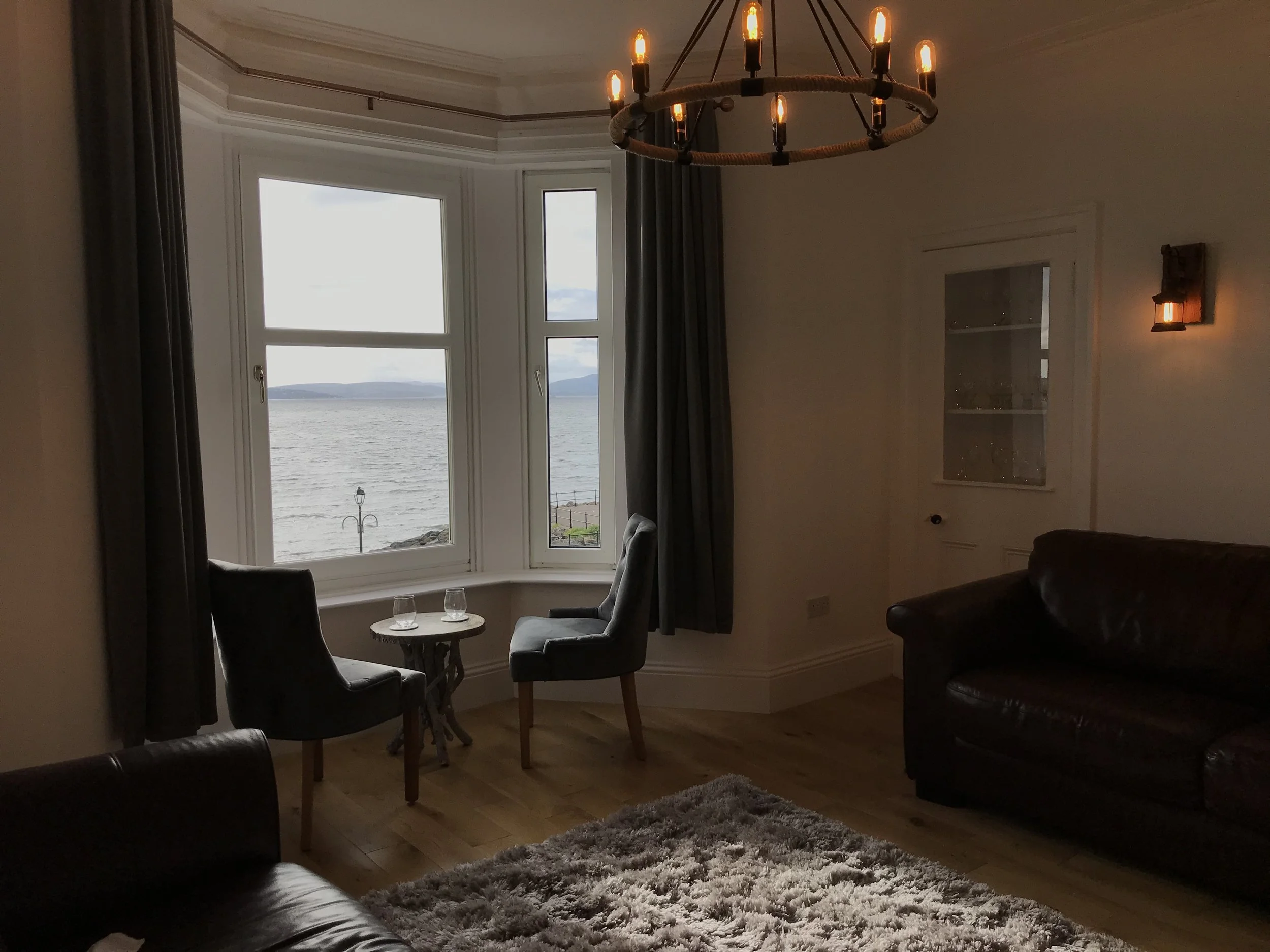 Our newly refurbished frontline seaside apartment boasts beautiful unobstructed views over Cumbrae and the Isles of Argyle & Bute. Facing due West, you won’t tire of the beautiful sunsets. The apartment is centrally located opposite the beach, with ferry terminal, town centre, bars, restaurants, train station and supermarkets all less than five minutes stroll. It is also 25 mins walk to the bustling Marina which has a further selection of restaurants and cafes.